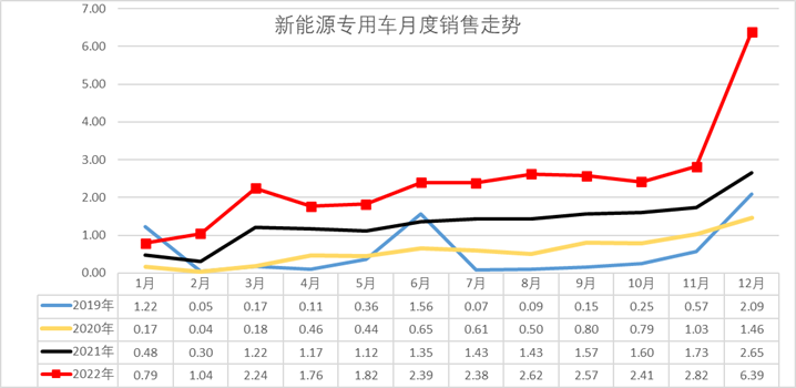 新能源专用车 2022 年 12 月的市场销量 6.39 万台,处于近 4 年销量异常高位,月度环比走势爆发上升,同比增长较强。