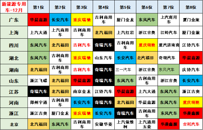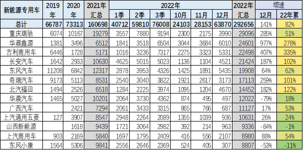 2022 年的新能源专用车市场总体看没有特别的强势厂家,吉利和奇瑞等全国性的优势企业不多,专用车与乘用车的竞争格局明显差异。