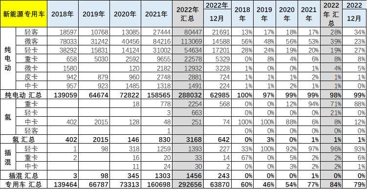 2022 年 12 月的新能源专用车市场销量 6.4 万台,同比增长 141%,环比 11 月增长 127%。2022 年 1-12 月达到 29.2 万台,同比增长 82%,12 月抢补贴增速较强。今年新能源专用车走势已经大幅超强于传统轻型车市场。