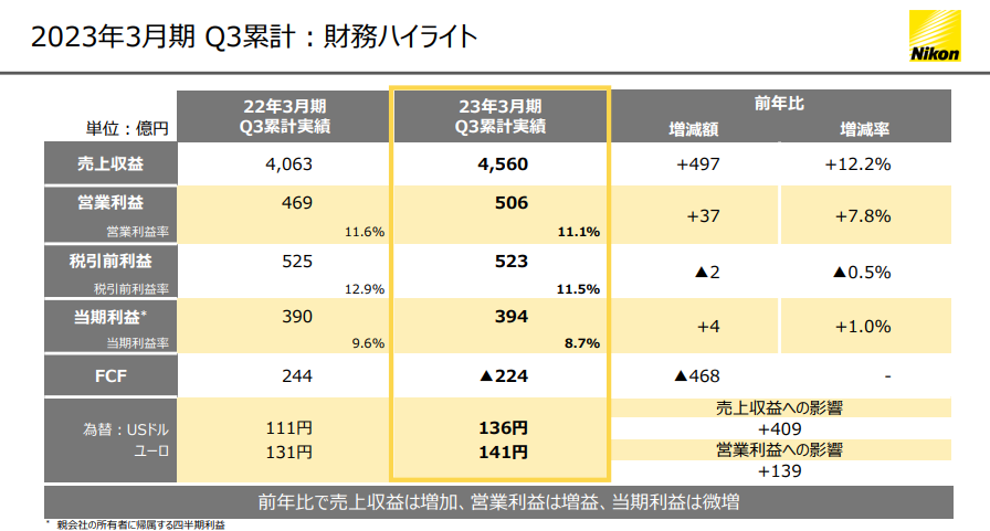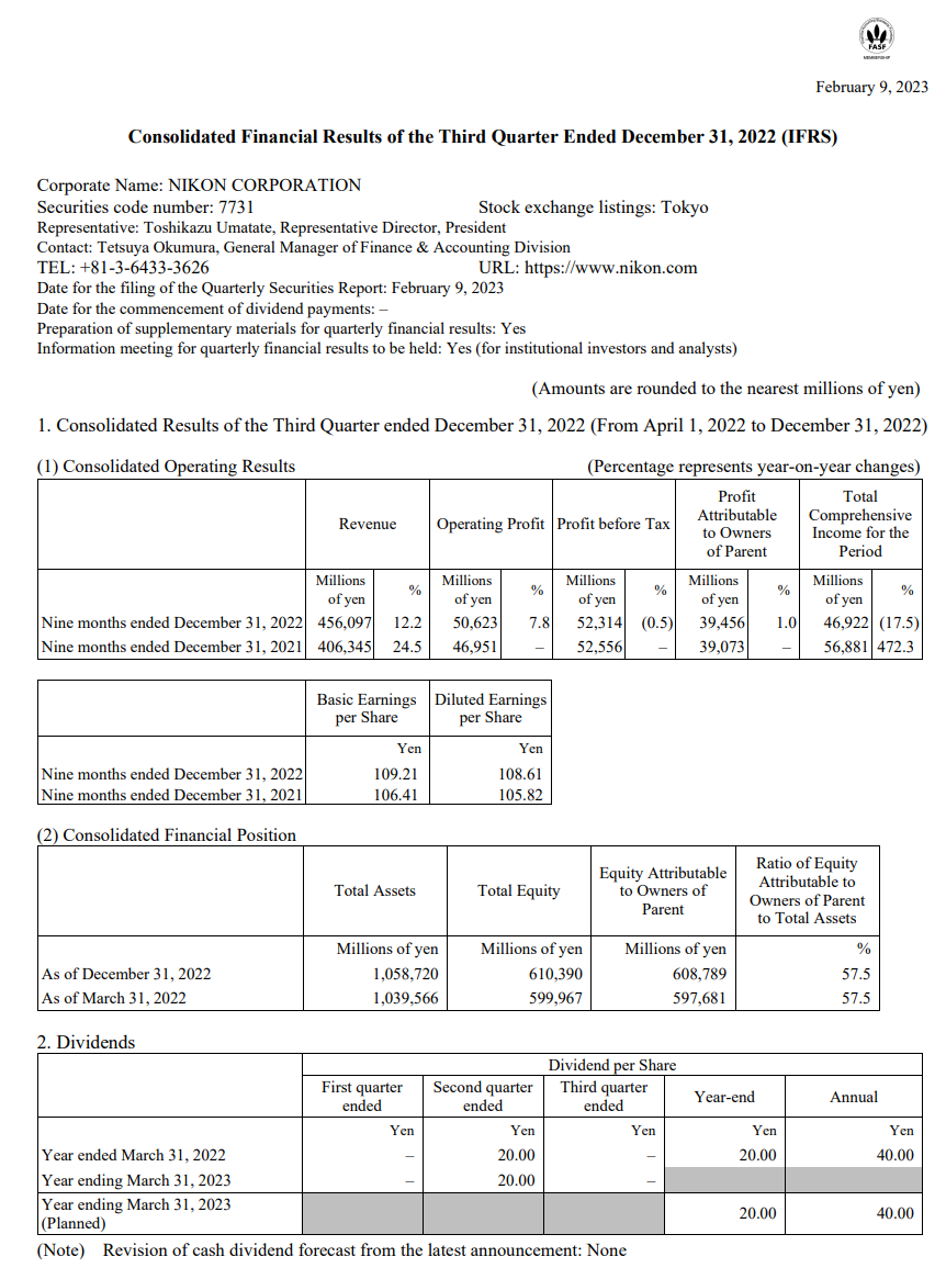 近日消息,尼康发布 2022 财年第三季(2022 年 10 月 1 日-2022 年 12 月 31 日)财报。