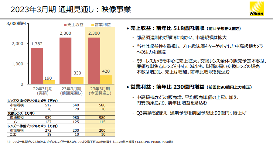 据介绍,尼康的影像业务在 Z9 热销和日元贬值的推动下营收和盈利均录得大幅增长,仅靠影像业务取得的销售收入就突破了 699 亿日元,同比增长 49.4%;营业利润高达 190 亿日元,同比增长 201.6%,因此尼康调高 2022 财年收入预期 29.1% 至 6300 亿日元。