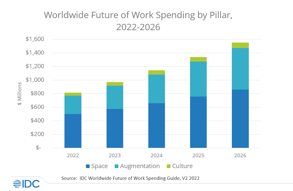 IDC全球最新预测,2023 年企业将在工作的未来(FoW) 上花费近 10 亿美元,比 2022 年增长 18.8%。