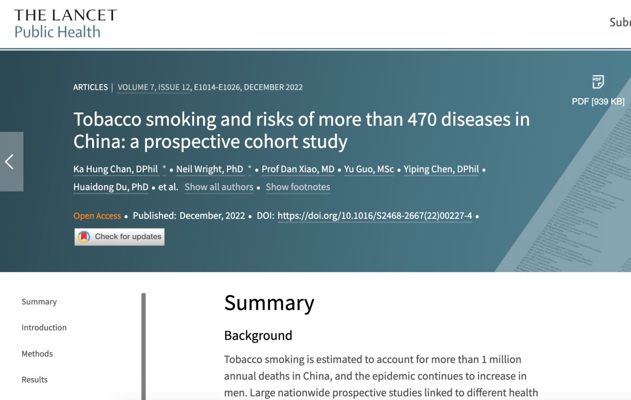研究由中国科技部等机构支持,英国牛津大学陈铮鸣教授、中国医学科学院王辰教授和北京大学公共卫生学院李立明教授的研究团队共同牵头完成。这是国内首个系统检查吸烟与全身疾病关系的大型全国性研究,共对超51万中国成年人进行了长达11年的随访调研。