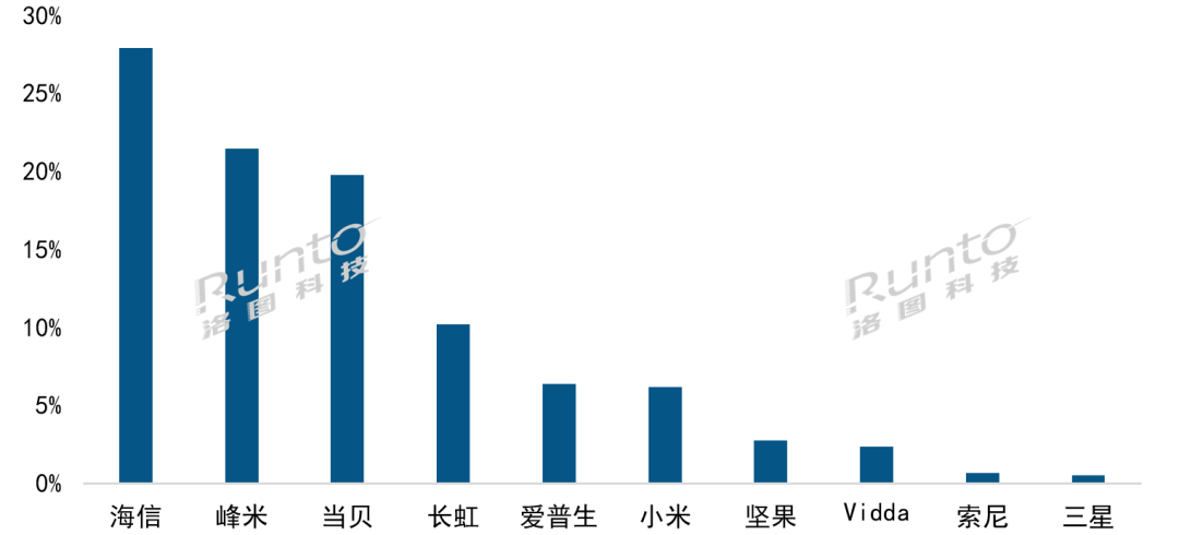 海信以近 30% 的市场份额位居市场第一,也是唯一一家销量超过 10 万台的品牌。峰米在超短焦和中长焦两个技术方向上持续发力,且价格亲民,市场份额超过 20%,同比提升了 3 个百分点。当贝上升至第三,市场份额接近 20%,除主力机型 X3 系列外,第 4 季度推出的激光超短焦 U1 也快速上量。长虹、爱普生分别以 10% 和 6% 的市场份额,排在四五名。