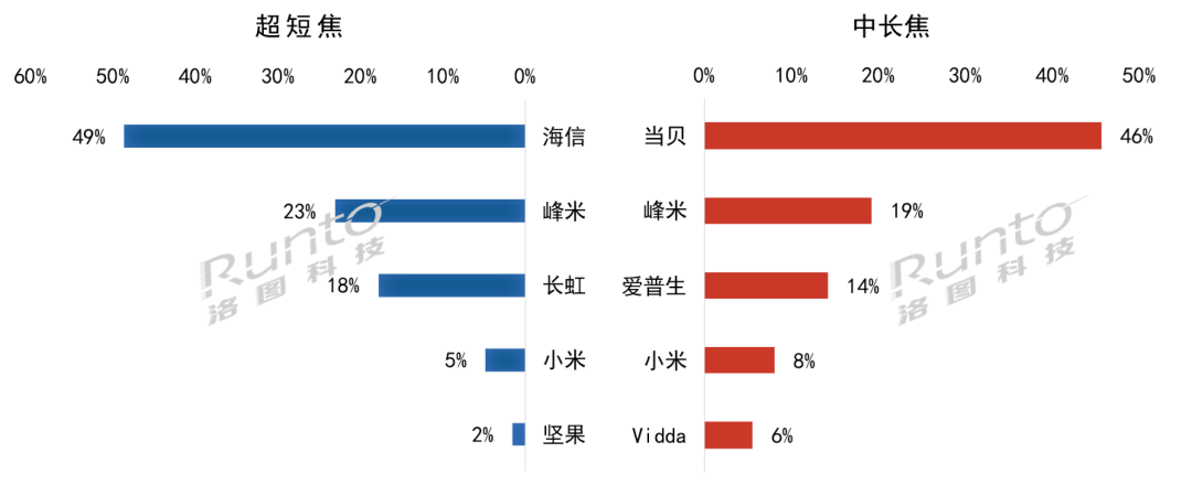 在中长焦技术方面,当贝主要依托 X3 系列,抢占该市场 46% 的份额。峰米 S5 抢占销量榜第二的位置。爱普生近年来加快开拓智能家用市场的步伐,卡位多条产品线,市场份额在 14% 左右。Vidda 当年上市即进入 TOP5 榜单,且在 4K 产品中取得占比 30% 的成绩。