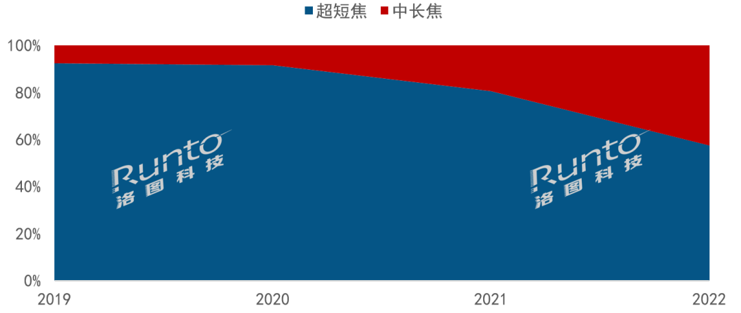 2022 年,家用激光投影市场在镜头技术结构上出现明显变化。超短焦与中长焦技术的出货量比例从 2021 年的 81:19 变为 2022 年的 57:43。