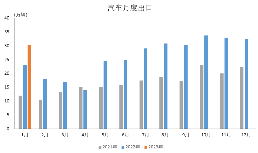 中国汽车工业协会:2023年1月汽车出口情况简析 据中国汽车工业协会统计分析,2023 年 1 月,汽车出口延续良好态势。 2023 年 1 月,汽车企业出口 30.1 万辆,环比下降 7.1%,同比增长 30.1%。 2023 年 1 月,乘用车出口 25 万辆,环比下降 8.9%,同比增长 35.6%。 2023 年 1 月,商用车出口 5 万辆,环比增长 3.5%,同比增长 8.1%。 2023 年 1 月,新能源汽车出口 8.3 万辆,环比增长 1.1%,同比增长 48.2%。 更多阅读:中国汽车工业协会: 2023年2月汽车出口情况简析中国汽车工业协会: 2023年4月汽车出口情况简析中国汽车工业协会:2022年7月汽车出口情况简析中国汽车工业协会:2023年3月汽车出口情况简析中国汽车工业协会:2023年5月汽车出口情况简析中国汽车工业协会:2023年6月汽车出口情况简析中国汽车工业协会:2024年6月汽车出口情况简析中国汽车工业协会:2022年3月前十位轿车品牌销量排名中国汽车工业协会:2021年5月汽车工业运行情况简述中国汽车工业协会:2023年1-2月我国汽车商品出口金额前十国情况简析中汽协:2024年5月汽车出口情况简析中汽协:2022年2月汽车出口情况简析中国汽车工业协会:2022年11月汽车出口情况简析中国汽车工业协会:2022年11月汽车工业经济运行情况中国汽车工业协会:2023年4月汽车工业产销情况简析