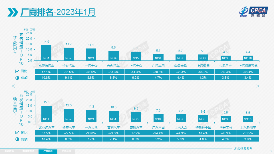 1月自主品牌零售64万辆,同比下降31%,环比下降40%。2022年自主品牌国内零售累计份额47%,相对于2021年同期又增长了6.1个百分点,2023年继续保持提升趋势。2023年1月自主品牌国内零售份额为49.4%,同比增长4.3个百分点;2022年自主品牌批发累计份额50%,相对于2021年同期增加6个百分点。2023年继续保持强势,1月自主品牌批发市场份额52.4%,较去年同期份额增加6.4个百分点;自主品牌在新能源市场和出口市场获得明显增量,头部传统车企转型升级表现优异,比亚迪汽车、长安汽车、吉利汽车、奇瑞汽车等传统车企品牌份额提升明显。
