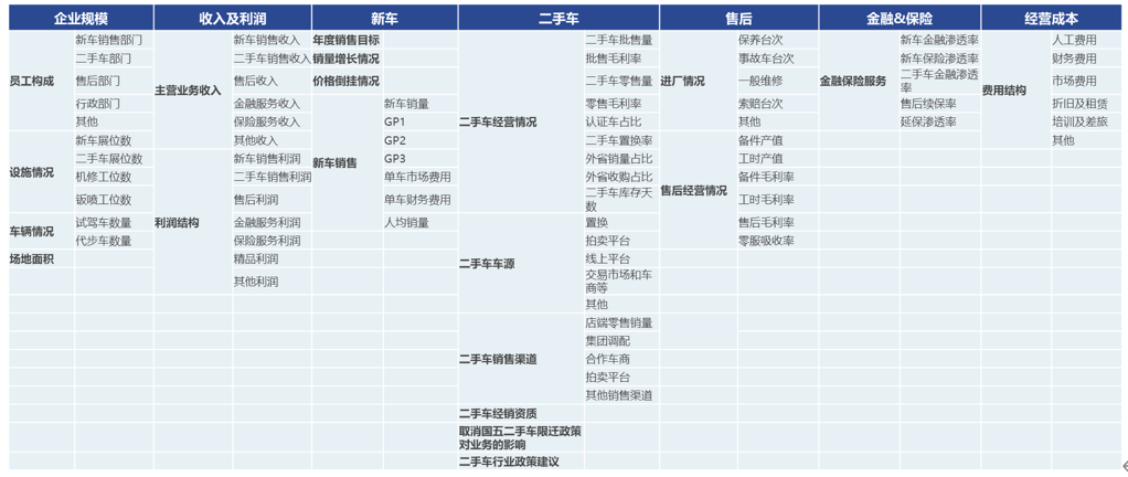 生存状况调查的主要内容包括:企业规模、年度目标完成、营业收入、车辆销售等指标,了解企业的经营情况,同时,根据市场不断变化、发展,了解经销商对政府、厂家及协会的建议、意见等;了解新的经营模式对经销商、市场的影响等。