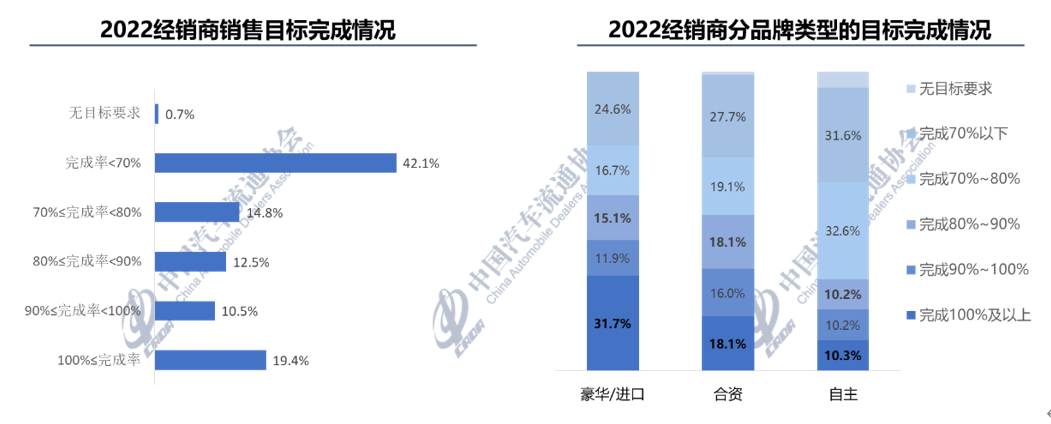 调查显示,完成年度销量目标的经销商占比为19.4%, 42.2%经销商完成了年任务指标的80%以上。其中,豪华/进口品牌经销商目标完成情况较好,31.7%经销商完成年度销售目标。
