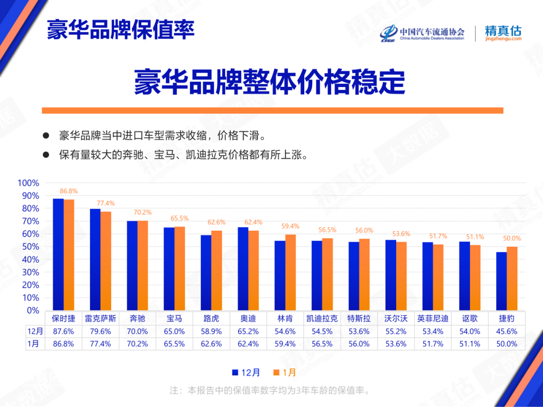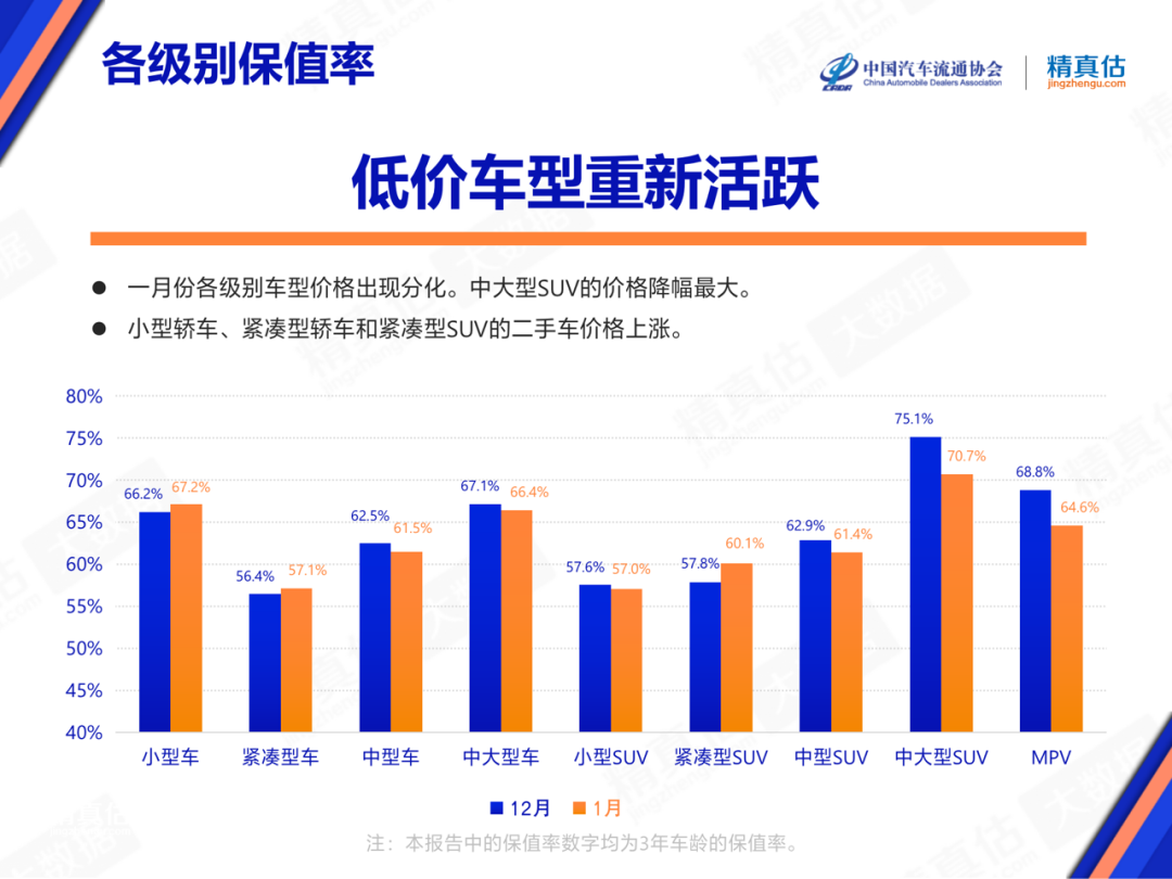 中国汽车流通协会和精真估联合发布了《2023年1月中国汽车保值率研究报告》。通过保值率研究旨在反映该品牌的产品力、认知度、美誉度等综合实力,对未来开展回购、置换、租赁、金融、新车定价参考等相关业务提供重要数据参考,从而降低业务风险,提升经营效率。