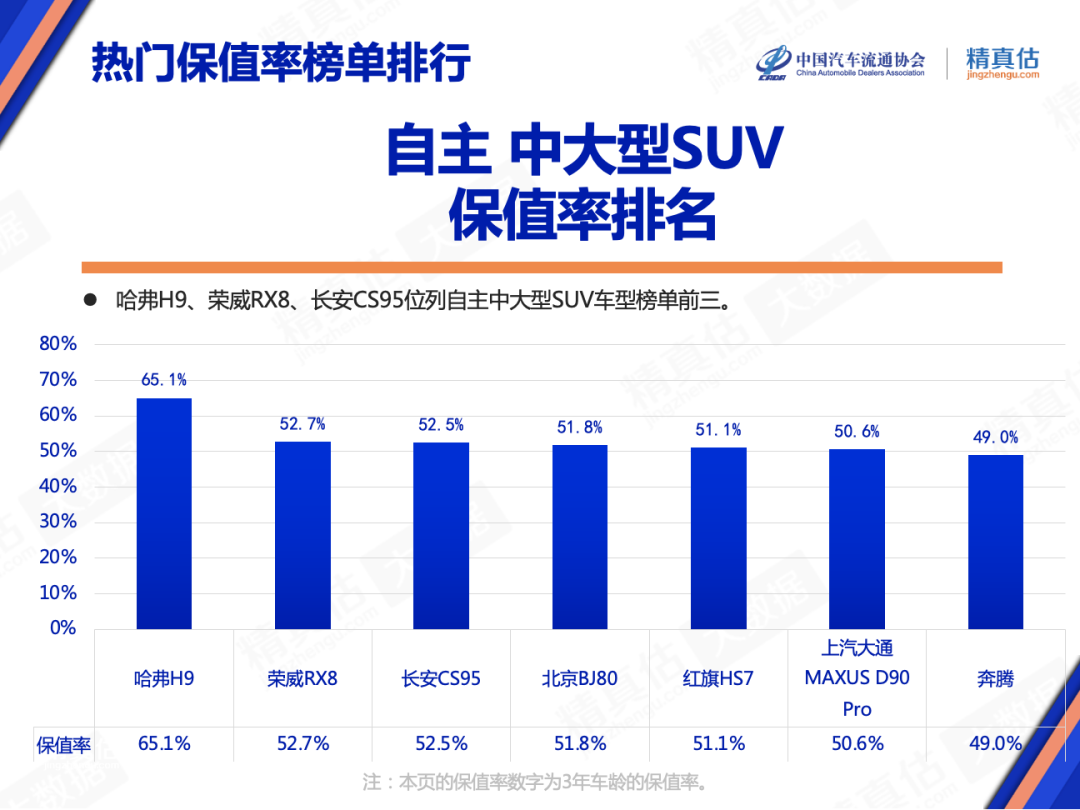 哈弗H9凭借强大的越野能力和丰富的配置在榜单中排名第一。荣威RX8是上汽集团的一款中大型SUV,采用非承载式车身,同样带有一定的硬派越野属性。此外,作为上汽荣威品牌定位最高的旗舰SUV,在兼顾较强的豪华特征外,荣威RX8的核心竞争力就是价格,考虑到车身尺寸、实用性以及各种配置,同级别竞争力还是很强的,保值率排名第二。长安CS95以轻微略势位列榜单第三名。