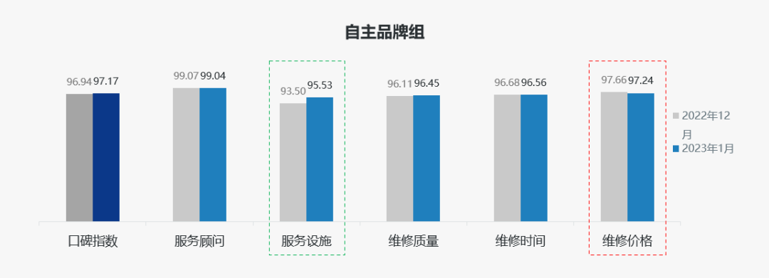 自主品牌组:自主品牌组售后服务口碑指数为97.17分,环比上升0.23分;本月售后服务五维度得分中,服务设施维度和维修质量维度有所提升,分别环比提升2.03分和0.34分,其他维度均略有下降,其中维修价格维度下降最多,环比下降0.42分,其次为维修时间维度,环比下降0.12分。
