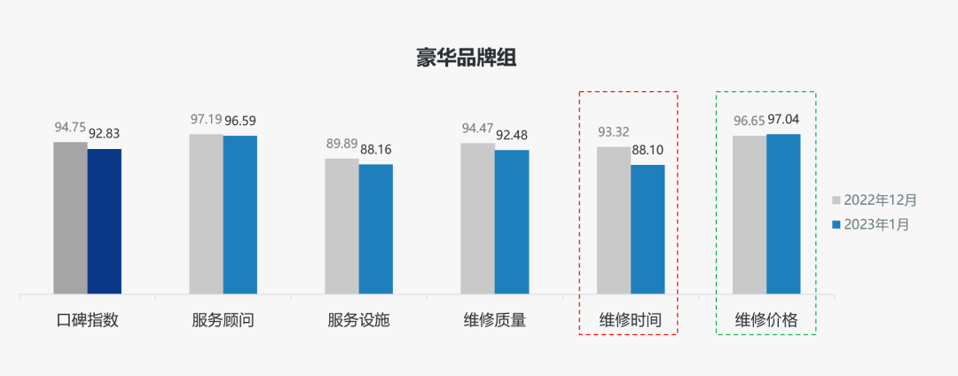 豪华品牌组:豪华品牌组售后服务口碑指数为92.83分,环比下降1.92分;在售后服务五维度中,仅维修价格维度有所提升,环比上升0.39分,其他维度均有所下降,其中维修时间维度下降最多,环比下降5.22分,其次为维修质量维度,环比下降1.99分。