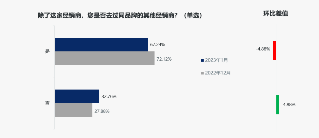 通过 “除了这家经销商,您是否去过同品牌的其他经销商?” 指标发现,去过同品牌经销商的比例环比降低了4.88%,初步判断受春节月各店购车优惠力度加大有关。