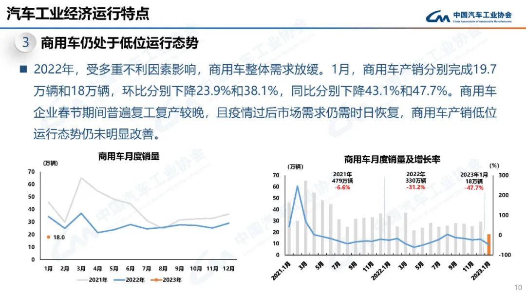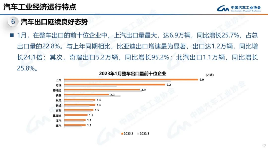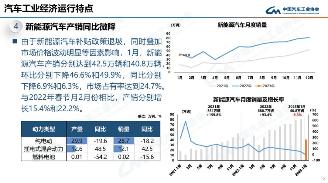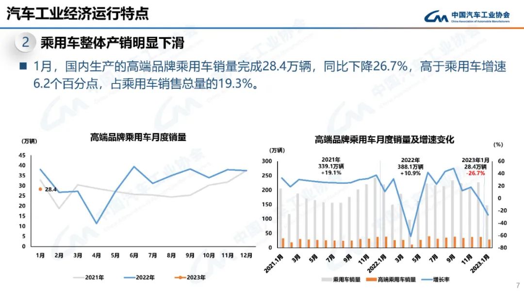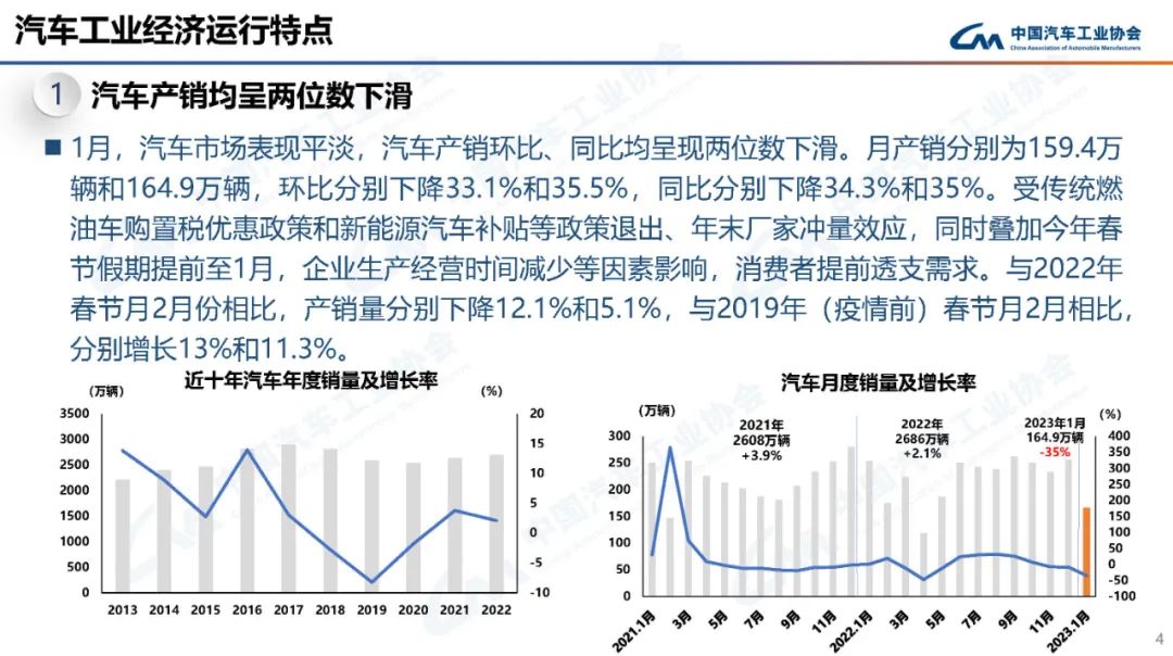 中国汽车工业协会:2023年1月汽车工业产销情况 据中国汽车工业协会统计分析,2023年1月,受春节假期及部分消费需求提前透支影响,叠加传统燃油车购置税优惠和新能源汽车补贴政策退出,汽车市场表现平淡,产销环比、同比均呈现两位数下滑。 更多阅读:中国汽车工业协会: 2023年5月汽车工业产销情况中国汽车工业协会:2023年7月汽车工业产销情况中国汽车工业协会:2023年3月汽车工业产销情况中国汽车工业协会:2023年8月汽车工业产销情况中国汽车工业协会:2022年11月汽车工业产销情况中国汽车工业协会:2022年汽车工业产销情况中国汽车工业协会:2022年3月前十位轿车品牌销量排名中国汽车工业协会:2023年1-2月我国汽车商品出口金额前十国情况简析中国汽车工业协会:2021年5月汽车工业运行情况简述中国汽车工业协会:2023年2月汽车工业产销情况中国汽车工业协会:2022年10月中国汽车工业经济运行情况中国汽车工业协会:2020年11月汽车工业经济运行情况中国汽车工业协会: 2024年7月汽车工业产销情况中国汽车工业协会:2021年4月中国汽车工业经济运行情况中国汽车工业协会:2023年4月中国品牌乘用车销售简析