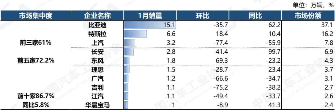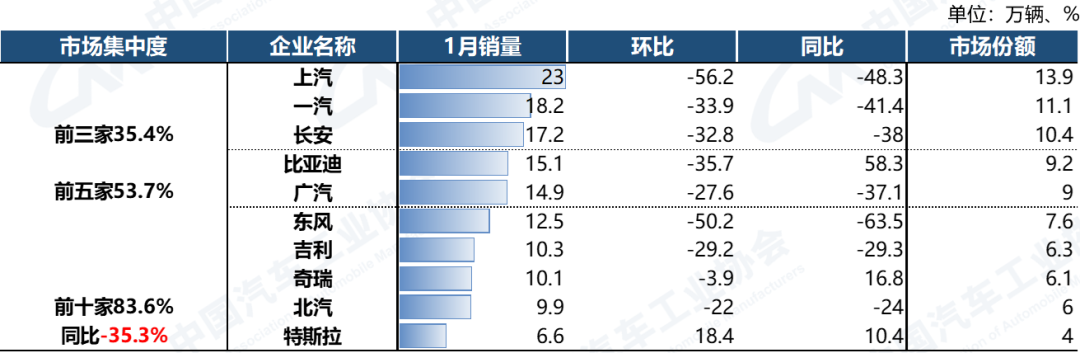 今年 1 月,汽车销量排名前十的企业分别为上汽、一汽、长安、比亚迪、广汽、东风、吉利、奇瑞、北汽、特斯拉。