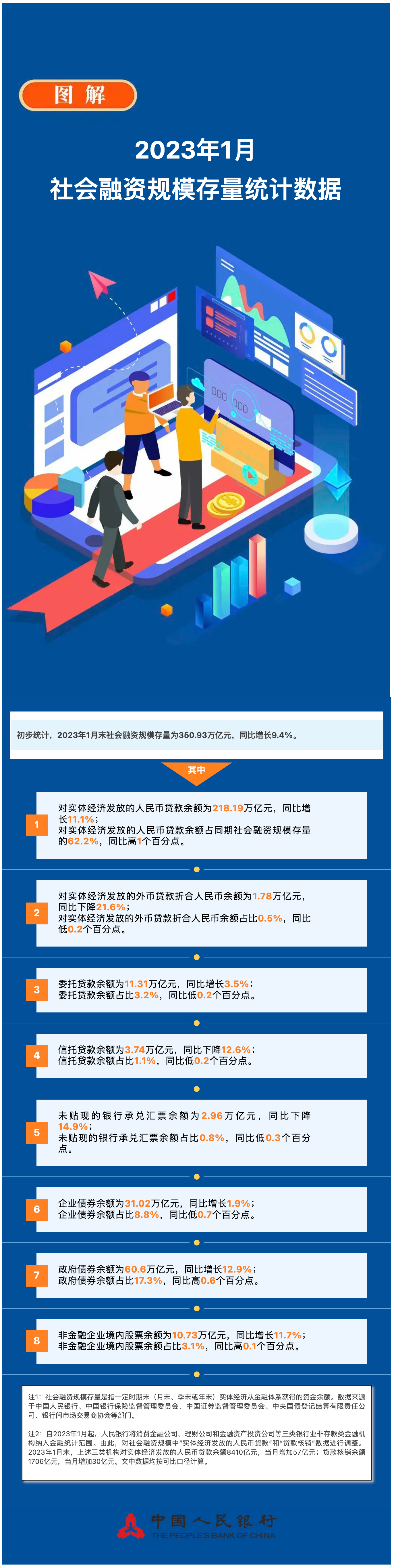 中国人民银行:2023年1月社会融资规模存量统计数据 更多阅读:中国人民银行:2019年第一季度城镇储户问卷调查报告中国人民银行:2022年8月社会融资规模存量统计数据中国人民银行:2022年6月社会融资规模存量统计数据报告中国人民银行:2022年5月社会融资规模存量统计数据报告中国人民银行:2021年社会融资规模存量统计数据报告中国人民银行:2023年3月社会融资规模存量统计数据报告中国人民银行:2019年11月社会融资规模存量统计数据报告中国人民银行:2022年9月社会融资规模存量统计数据报告中国人民银行:2022年3月社会融资规模存量统计数据报告中国人民银行:2022年2月社会融资规模存量统计数据报告中国人民银行:2021年11月社会融资规模存量统计数据报告中国人民银行:2021年10月社会融资规模存量统计数据报告中国人民银行:2021年2月社会融资规模存量统计数据中国人民银行:2020年3月社会融资规模存量统计数据报告中国人民银行:2015年3月末社会融资规模存量为127.52万亿元 同比增长12.9%
