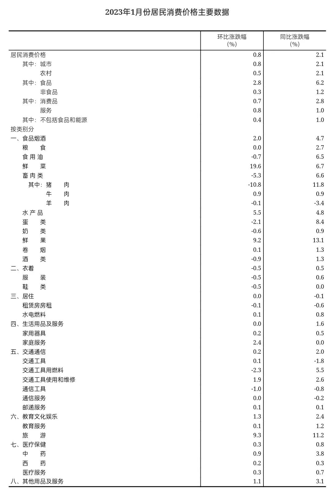 2023年1月份,全国居民消费价格同比上涨2.1%。其中,城市上涨2.1%,农村上涨2.1%;食品价格上涨6.2%,非食品价格上涨1.2%;消费品价格上涨2.8%,服务价格上涨1.0%。