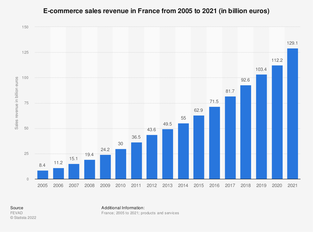 2021年,法国电子商务销售额超过1290亿欧元。这比去年在线销售额超过1120亿欧元的数字增长了15%。