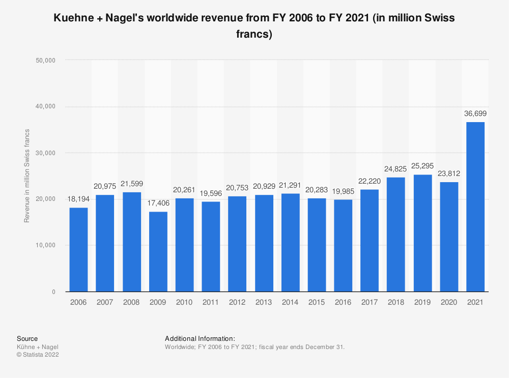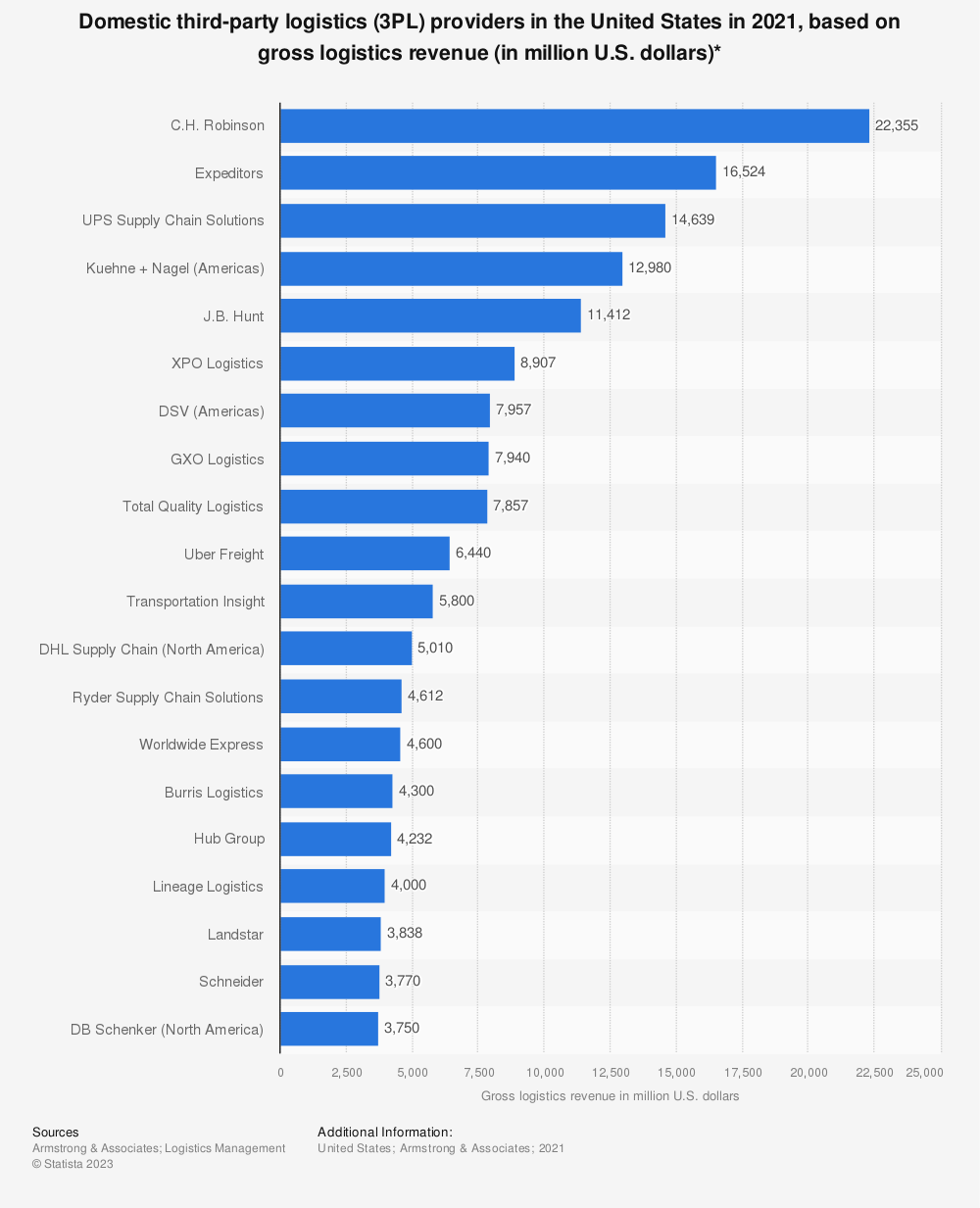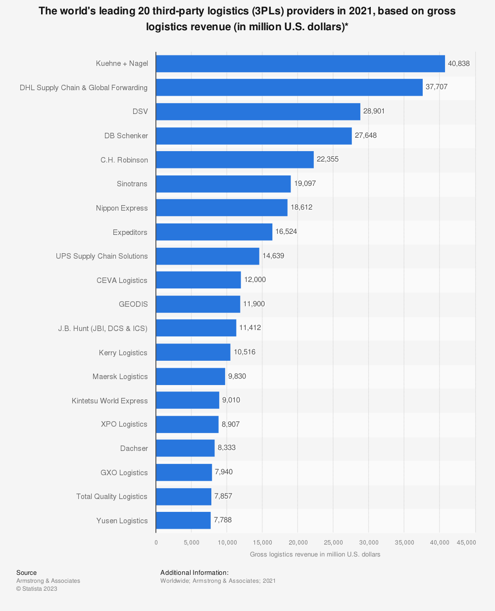 物流业不断增长的经济机会和多样化的公司结构,孕育了一个高度竞争的商业环境。因此,新的公司进入,低效的公司退出第三方物流服务市场。在2021年,大多数3PL供应商经历了总收入的大幅增长。在这一年,Kuehne + Nagel、DHL供应链和全球货运、DSV和DB Schenker是全球领先的第三方物流服务公司。同年,C.H. Robinson、Expeditors和UPS Supply Chain Solutions成为美国领先的第三方物流公司。激烈的竞争很容易破坏主导公司在市场上的地位。例如,瑞士公司Kuehne + Nagel在2006年至2017年期间面临收入波动,主要是由于激烈的竞争。自2018年以来,该公司表现更好,并在2021年达到367亿瑞士法郎的峰值收入。