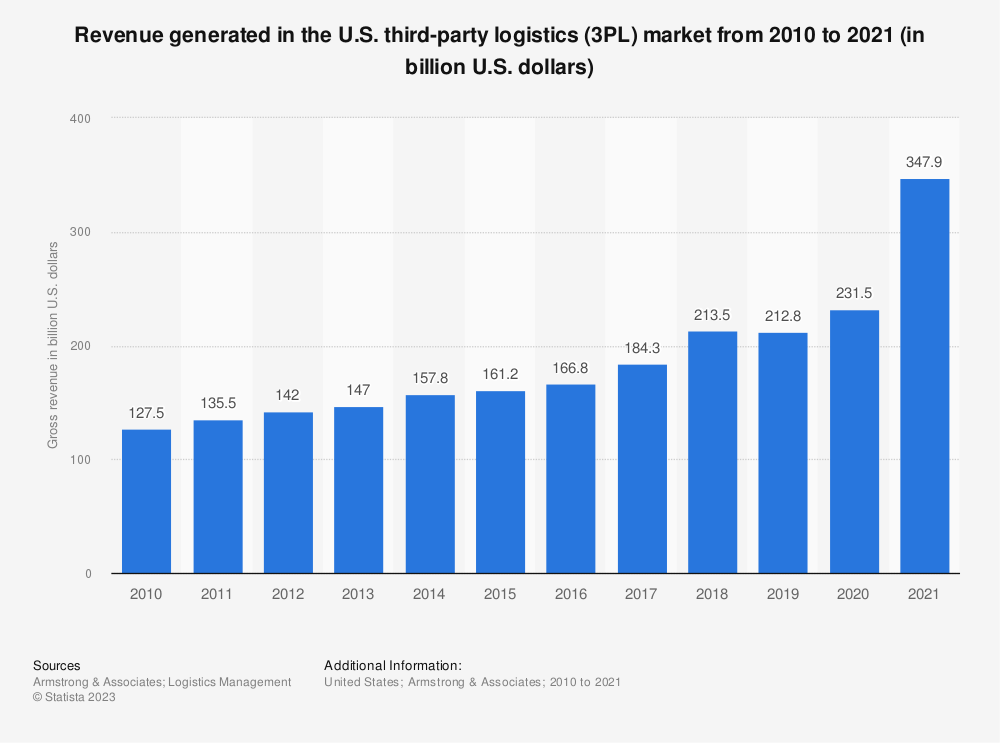 3PL在美国是一个新兴产业。该行业的总收入每年都在增长,仅2021年就飙升至3479亿美元。