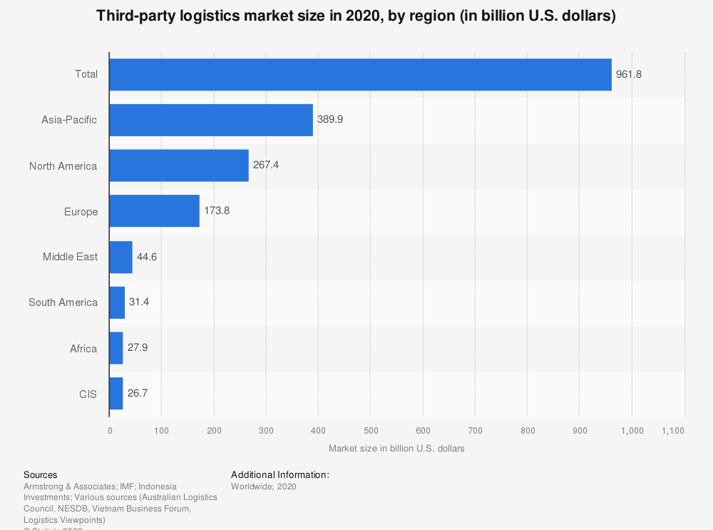 总的来说,3PL提供全套物流服务,从仓储和订单到库存管理和自动化运输。3PL使工业组织能够进入全球供应链物流供应商的更大服务网络。例如,一家制造企业将第三方物流系统整合到其生产和运营系统中。因此,为配送、储存和运输提供量身定做的解决方案。到2020年,第三方物流市场参与者创造的经济价值超过9610亿美元。