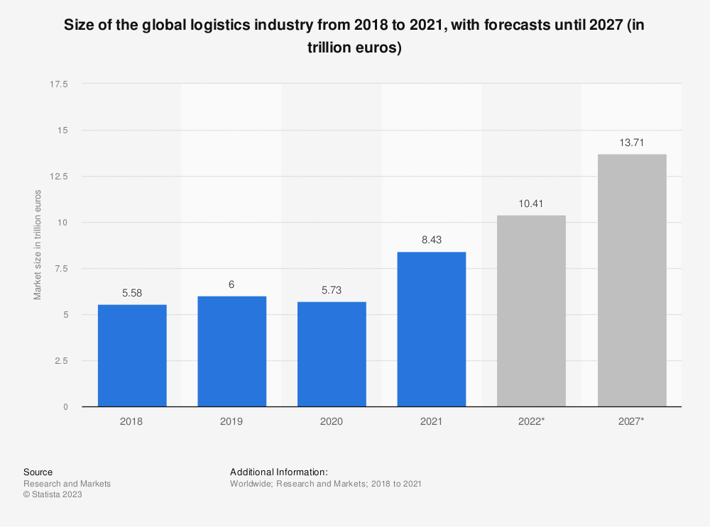 2018-2021年全球物流业规模,预测至2027年(万亿欧元) 数据来源:Statista.com