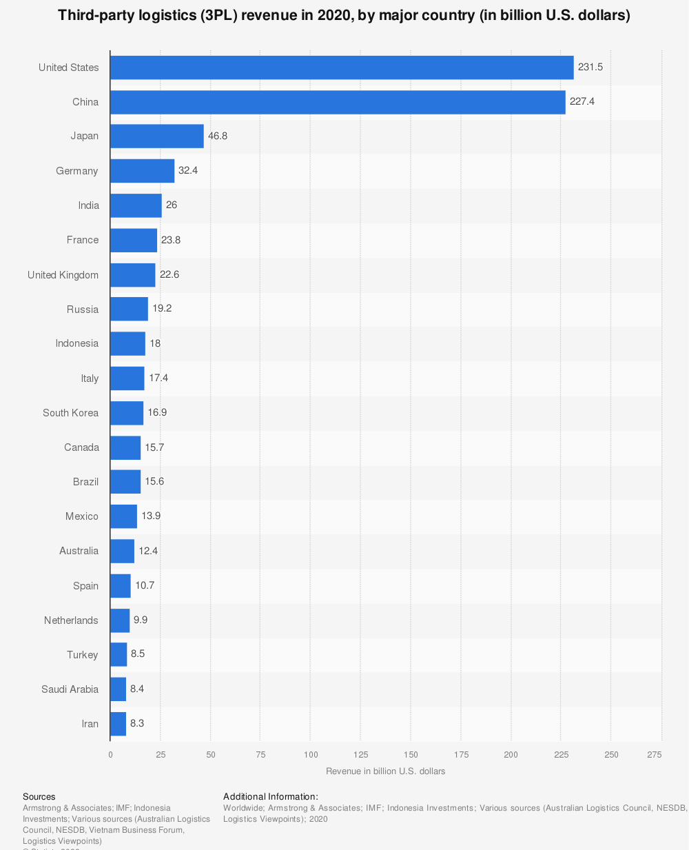 按国家比较,美国和中国在3PL市场产生了最大的收入,占全球收入的近一半。2021年,美国3PL行业的总收入飙升至约3480亿美元。下面这一数据代表了2020年3PL市场的全球收入流,按主要国家分类。在美国,3PL收入达2315亿美元,成为当年最大的市场。