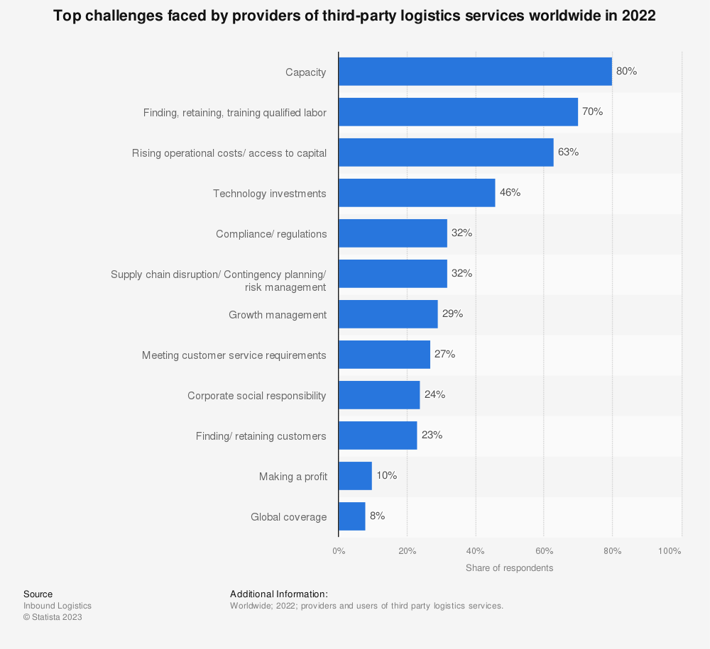 像许多行业一样,物流业也不能幸免于一些公司为寻求更高的利润而进行的潜在破坏。公司的动态使目前的市场主导者暴露在不确定和破坏性的情况下,通过高效、可持续和更有利的新业务方式挑战3PL业务的现状。除了外部商业挑战,3PL企业也面临着许多内部挑战。在2022年的调查中,3PL服务的供应商和用户表示,能力、寻找或保留、培训合格的劳动力,以及不断上升的运营成本是3PL行业的三大挑战。目前,3PL服务提供商提供入境物流、综合物流、领先物流、库存管理等服务。3PL企业采取的创新措施之一是将物联网技术融入供应链服务,以提前面对即将到来的挑战。