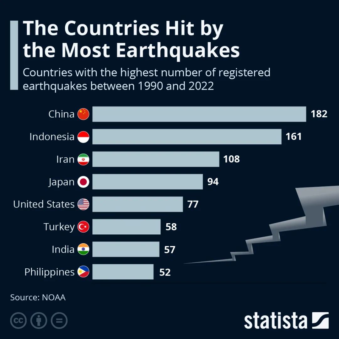 在这段时间内,受地震影响最多的两个亚洲大国是中国(182次)和印度尼西亚(161次)。受影响更严重的亚洲地区是日本、印度和菲律宾。意大利有23次地震,是欧洲最危险的地区之一。