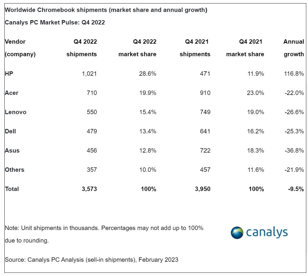 虽然 Chromebook 连续第六个季度出现下滑,但 2022 年第四季度的降幅比前五个季度要小,出货量同比仅下降 10%。