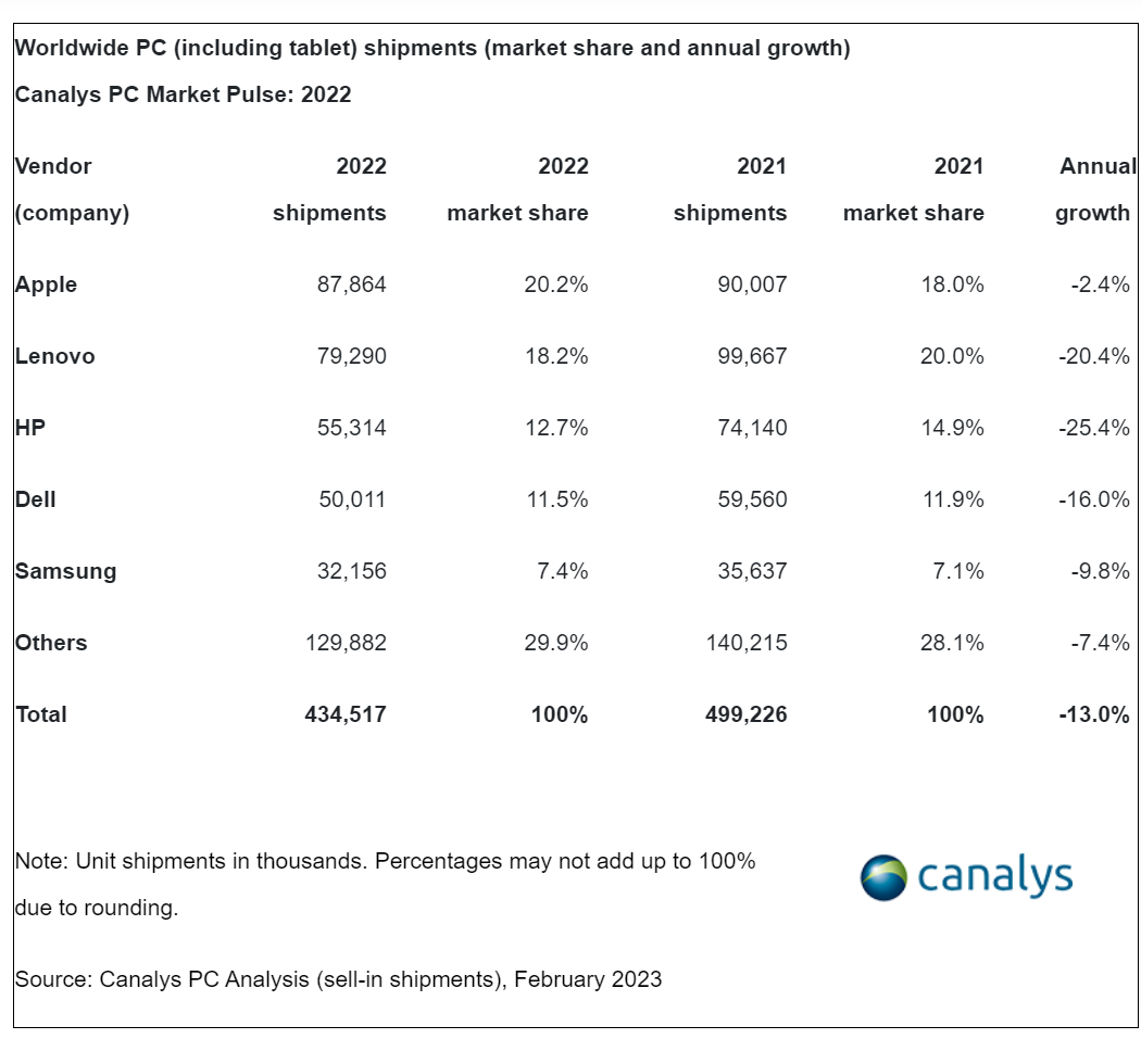 2022 年第四季度的PC市场(台式机、笔记本和平板电脑)中,苹果以 2550 万台的出货量位居第一,同比增长 5%,市场份额扩大至 24%。联想以 1790 万台出货量和 32% 的降幅排名第二。惠普和戴尔仍位居第三和第四,出货量分别为 1320 万台和 1090 万台。 在平板电脑增长的支持下,三星以 6% 的同比增长和 830 万台的设备出货量跻身前五。