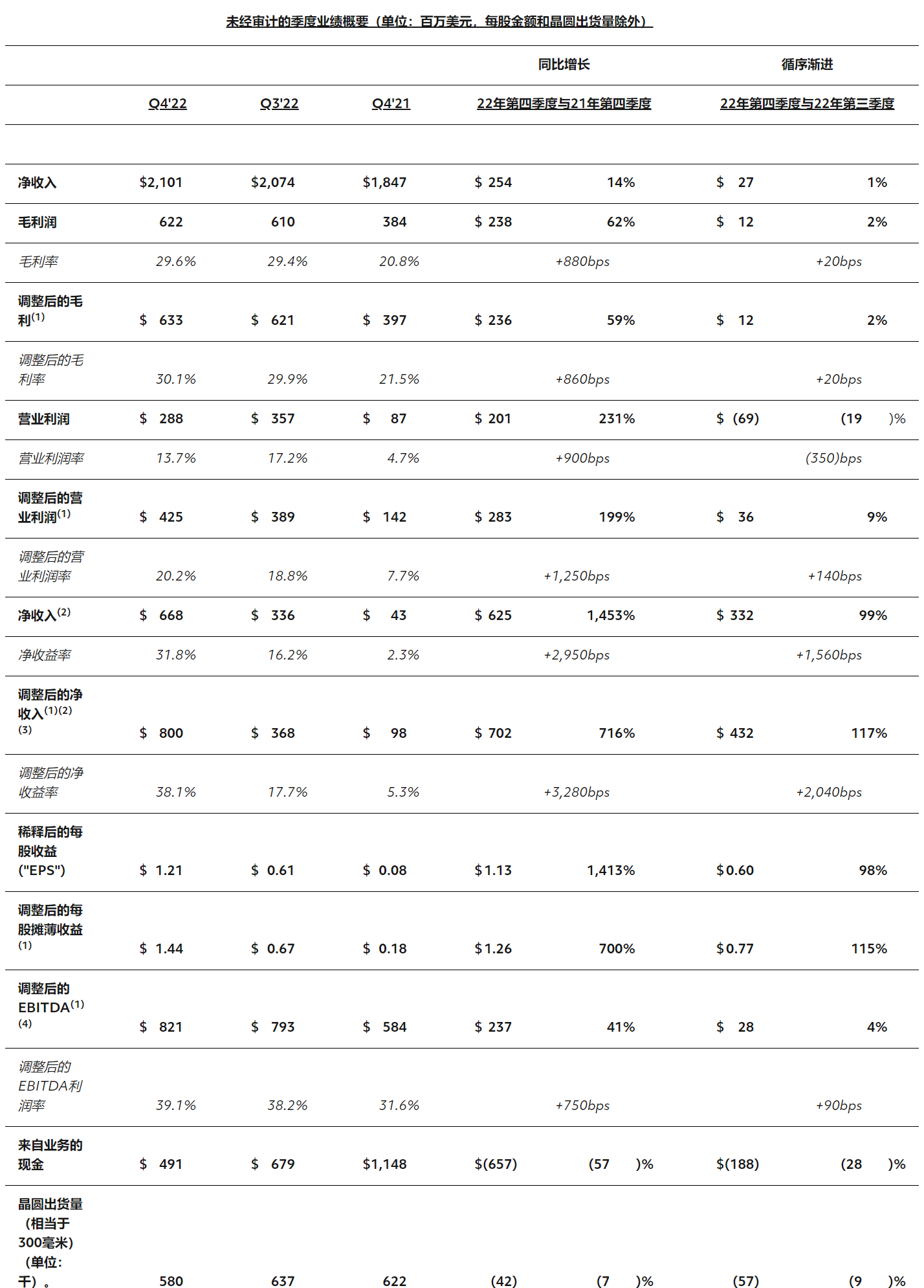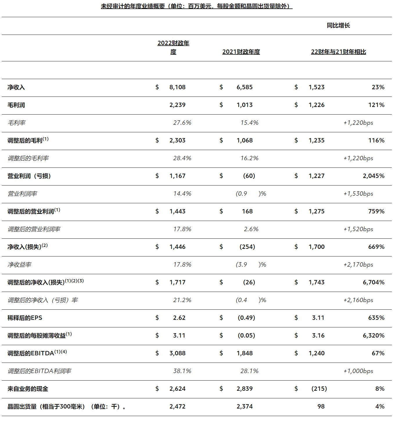 格芯 2022 年全年营收 81.08 亿美元,同比增长 23%;毛利润为 22.39 亿美元,与去年的 10.13 亿美元相比几乎翻了一番;毛利率为 27.6%,高于去年的 15.4%;调整后的毛利率为 28.4%;营业利润为 11.67 亿美元;净利润为 14.46 亿美元,而去年仅有 2.54 亿美元;净利润率为 17.8%,调整后 EBITDA 利润率为 38.1%;每股摊薄收益为 2.62 美元,高于去年的 0.49 美元。