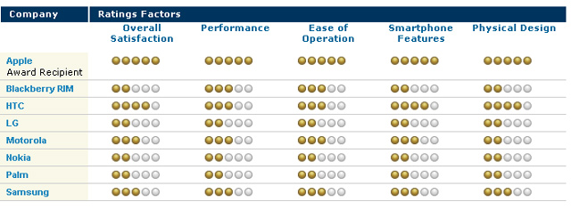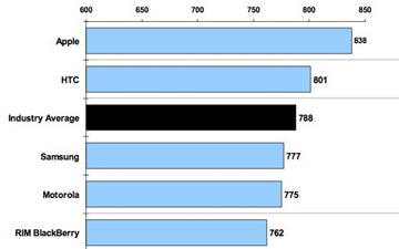 JD Power:2011年无线智能手机消费者满意度研究 Apple第一 根据JD Power的调查,Apple在满意度方面高居美国智能手机榜首。Apple以838分的成绩傲视群雄,尤其在操作和功能的易用性方面。HTC位居第二,然后是三星、摩托和RIM。诺基亚表现比较平庸,只有721分。比Palm还糟。 在对智能机钟爱的特性方面,轻的智能机比重的智能机更受青睐;用户评价智能机的指标有表现(35%)、易用性(24%)、功能(21)和外观设计(20%)。 该研究也反映出用户倾向4G连接功能。 更多阅读:comScore:2012年5月美国移动市场份额J.D.Powter:智能手机消费者满意度调查 iPhone连续第9次获得第一Canaccord Genuity:2009年Q4-2011年Q3手机行业市场份额呈两极化趋势comScore:2011年7月Android 和 Apple 占 70%美国智能手机市场JD Power:调查显示2013年美国智能手机满意度排行榜 苹果iPhone最高JD Power:2022年汽车出厂质量调查报告 车企新车质量同比下滑 11%comScore:截至2012年5月底Android美国市场份额增至51%ZDC:2011年Q3中国智能手机市场研究报告comScore:2011年Q3美国智能手机市场状况分析Gartner:2012年全球手机销量减少1.7%RIM美国市场份额下降致股价创7年来新低JD Power:2021年中国新能源汽车初始质量研究报告 特斯拉质量处于中国市场“平均水平之下”J.D. Power:新冠大流行让司机对已有汽车的品牌更加忠诚JD Power:2021年美国零售银行满意度调查报告J.D. Power:2021年中国新车购买意向 超六成95后想买国产车