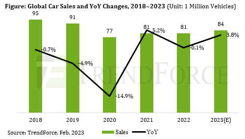 根据 TrendForce 的分析,2022 年全球汽车销量同比下降 0.1%,达到8105 万辆,与 2021 年的数字比几乎没有变化。不过,今年全球汽车市场仍有机会恢复正增长。TrendForce 目前预测,2023 年全球汽车销量将同比增长 3.8%,达到8410 万辆。
