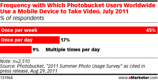 Photoebucket网站的数据显示2010年7月到2011年7月,该网站的数据增加了3倍;2011年7月份,来自移动设备的上传是2010年12月的14倍;通过对网站用户的调研发现,一半的用户每周一次会使用移动设备录像。9%的用户一天会多次这样。