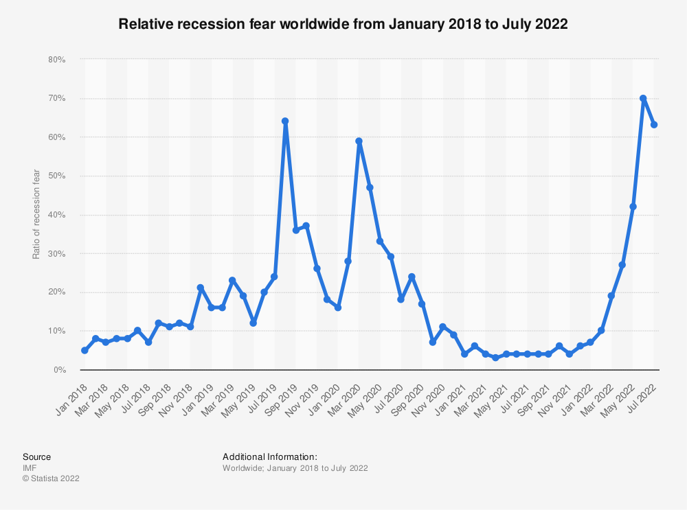 在2018年1月至2022年7月期间,全球衰退恐惧经历了三次急剧增加的时期。首先,在2019年夏天,由于中美关系升级和债券市场闪现衰退信号。第二次全球经济衰退恐惧的高峰发生在2020年3月,由于新冠病例率惊人地飙升。2022年2月,随着俄罗斯和乌克兰之间的冲突升级,对经济衰退的恐惧又开始急剧增加。