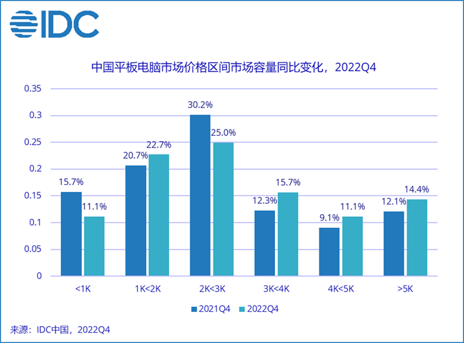 分价位段来看,2022年第四季度中国平板市场变化情况对比同期,小于1K和2K-3K产品的市场容量出现下降,1K-2K主流品牌产品及3K以上中高端产品份额有所增长。
