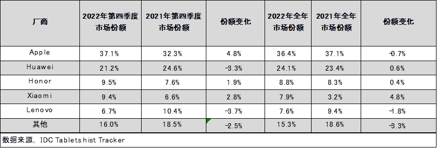 2022年,中国平板电脑市场排名前五厂商具体市场份额及变动如下: