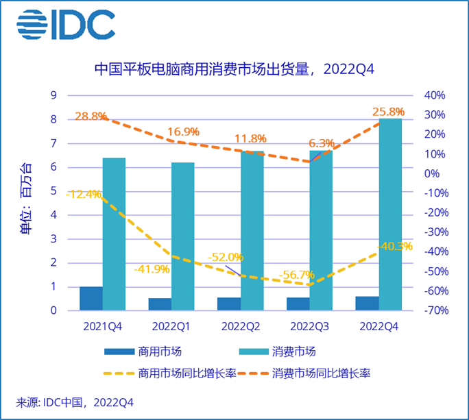 根据最新国际数据公司(IDC)平板电脑季度跟踪报告,2022年第四季度,中国平板电脑市场出货量约866万台,同比增长约16.7%,其中消费市场同比增长25.8%,商用市场同比下降40.3%。