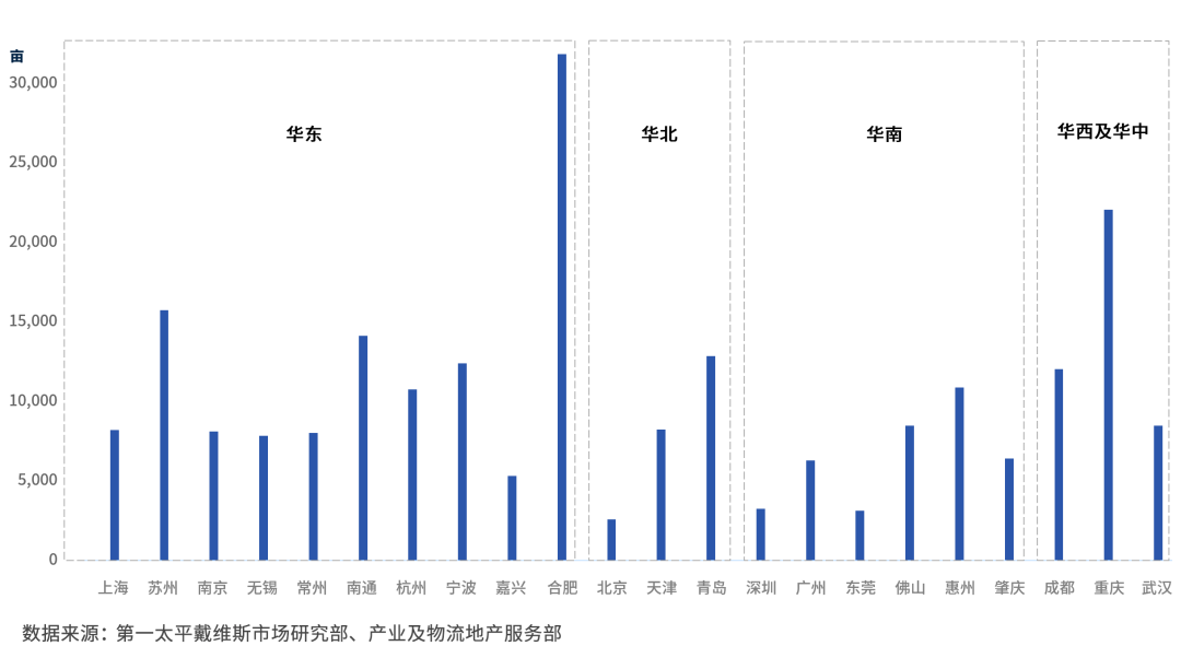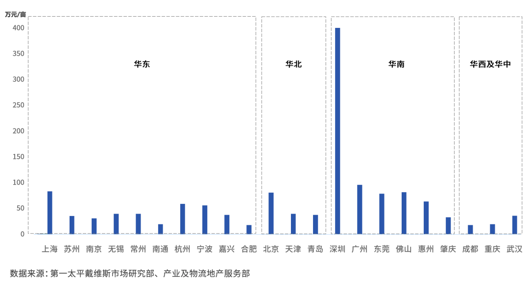 华东区域物流及产业园资产交易活跃程度均为全国之最,上海和大苏州成交面积和均价高于其他重点城市。