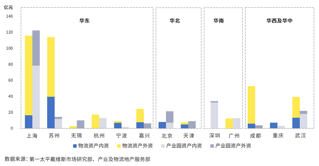 外资对物流资产投资占比较大,主要集中在华东及华南的一二线城市,对产业园资产的投资占比相对较少,集中于华东及华北的一线城市;