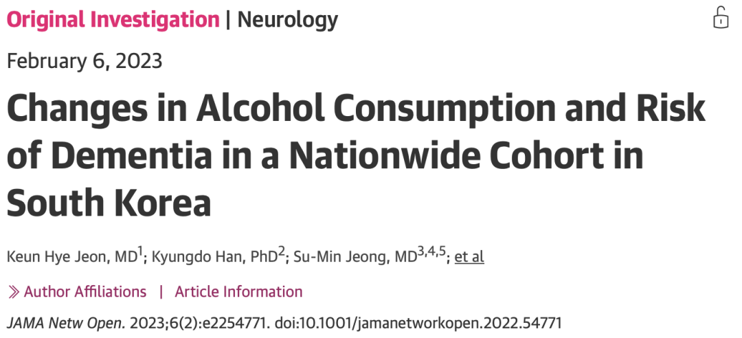 [2]Jeon KH, Han K, Jeong SM, Park J, Yoo JE, Yoo J, Lee J, Kim S, Shin DW. Changes in Alcohol Consumption and Risk of Dementia in a Nationwide Cohort in South Korea. JAMA Netw Open. 2023 Feb 1;6(2):e2254771. doi: 10.1001/jamanetworkopen.2022.54771. PMID: 36745453.