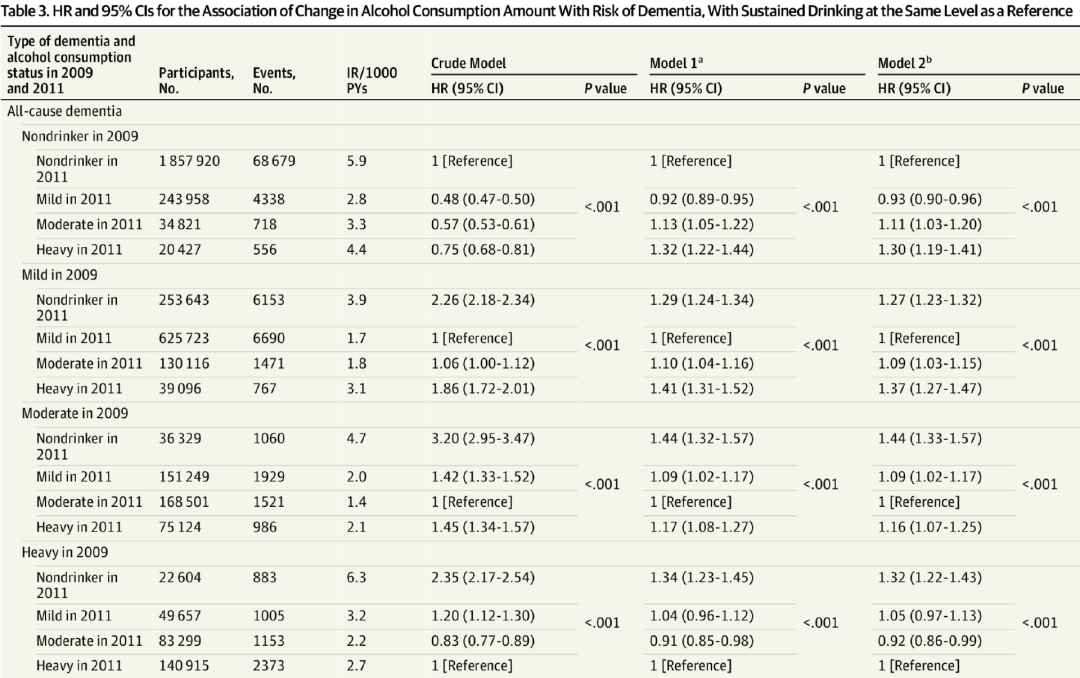 不过,出乎意料的是,如果以前滴酒不沾,但逐步培养起“小酌一杯”的习惯,反而能降低罹患痴呆症的风险!与持续不饮酒的相比,从不饮酒发展为轻度饮酒,罹患全因痴呆症和AD的风险分别显著降低7%和8%。
