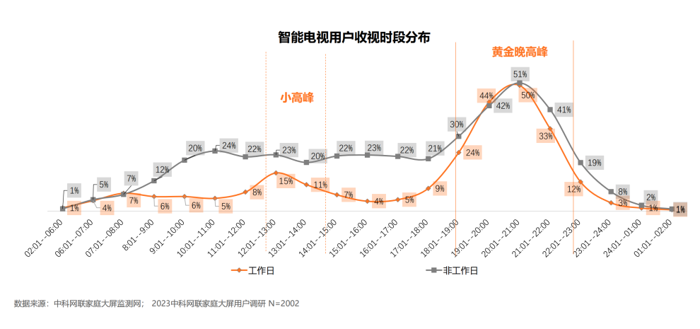 工作日:用户收视时段趋于集中,除黄金晚高峰时段以外,午间为小高峰;