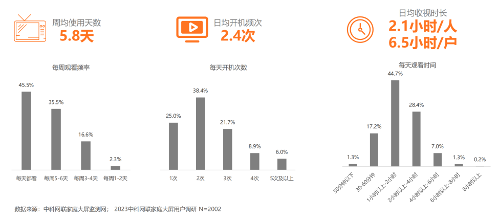 调查研究表明,智能电视受众的使用行为非常活跃,周均使用天数为5.8天;75%的受众日开机频次为2次及以上;同时日均收视时长为2.1小时/人。