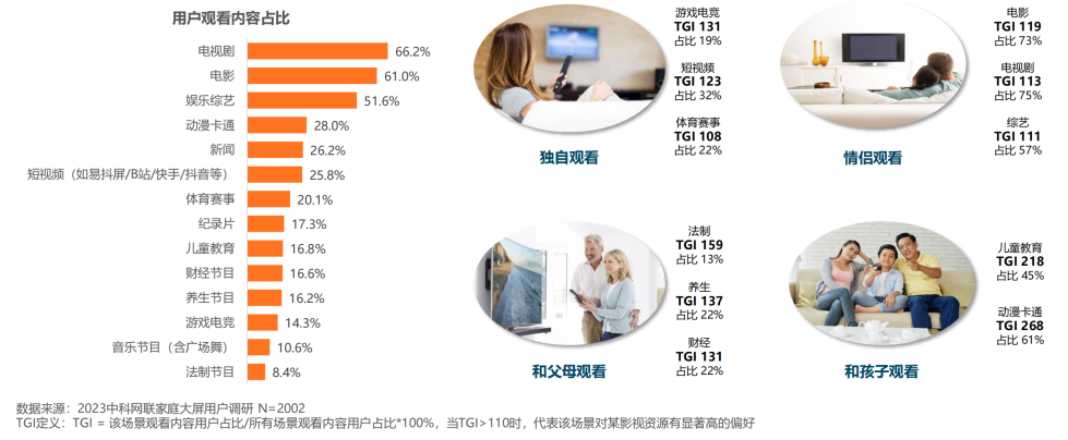 ☆ 一老一少收视内容类型更典型,法制、养生、财经节目可精准定向中老年群体;儿童教育、动漫卡通可精准定向儿童家庭;游戏电竞、短视频、体育赛事年轻受众浓度更高。