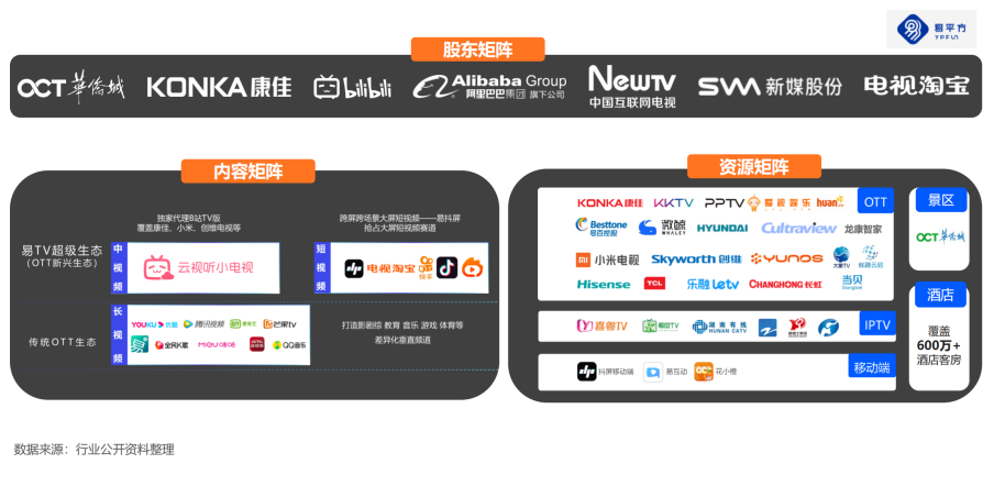• 易平方独家整合康佳、KKTV、B站TV版、易抖屏、华侨城景区等的流量矩阵可运营流量规模覆盖终端超2亿。