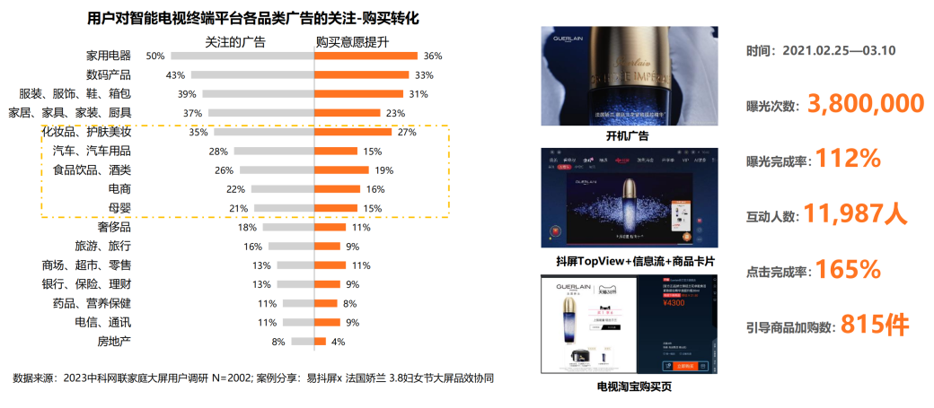 ☆ 智能电视用户在智能电视终端平台上接触的广告中,关注度最高的是家用电器、数码产品、服装/服饰三大品类,化妆品、食品饮料、电商、母婴类广告在大屏端的投放对于消费者购买意愿的提升效果表现显著;